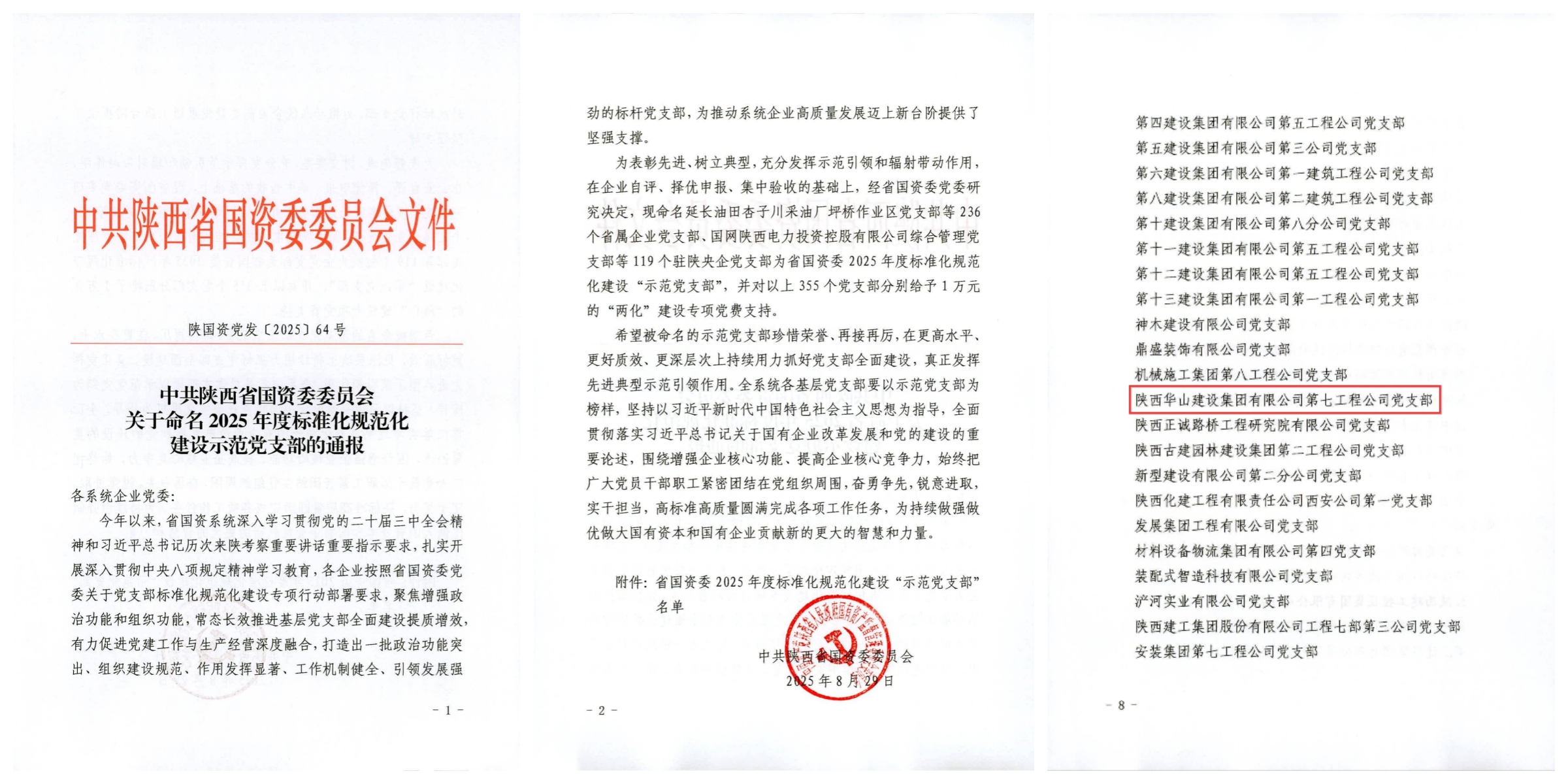 近日,陜西省國資委黨委通報了2025年度標(biāo)準(zhǔn)化規(guī)范化建設(shè)示范黨支部名單,陜建華山建設(shè)集團(tuán)第七工程公司黨支部榮獲“陜西省國資委標(biāo)準(zhǔn)化規(guī)范化建設(shè)示范黨支部”榮譽(yù)稱號。這是陜建華山建設(shè)集團(tuán)黨委深入貫徹落實(shí)新時代黨的建設(shè)總要求,持續(xù)夯實(shí)基層黨建基礎(chǔ)、推動黨建與中心工作深度融合的一項重要成果。