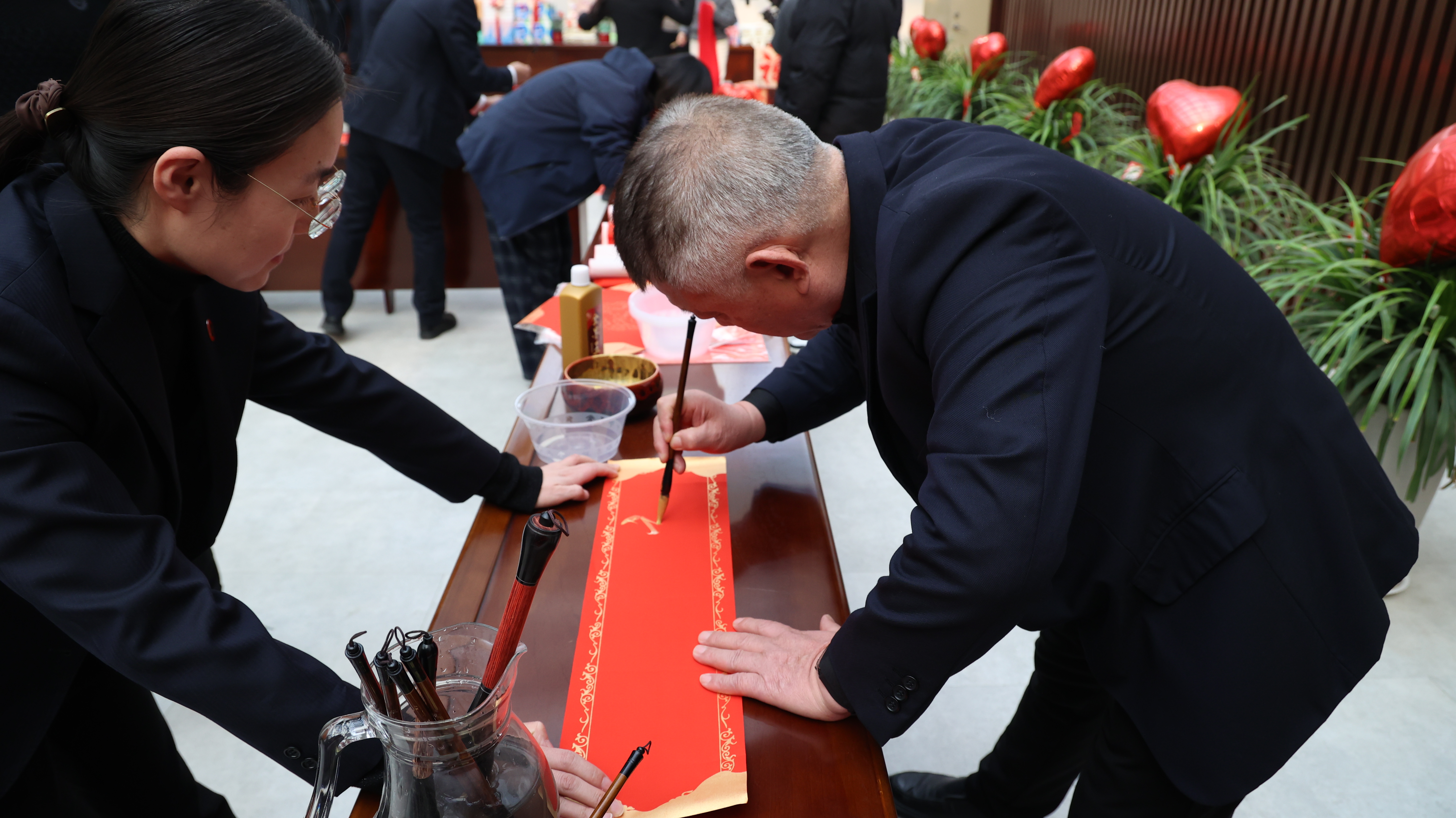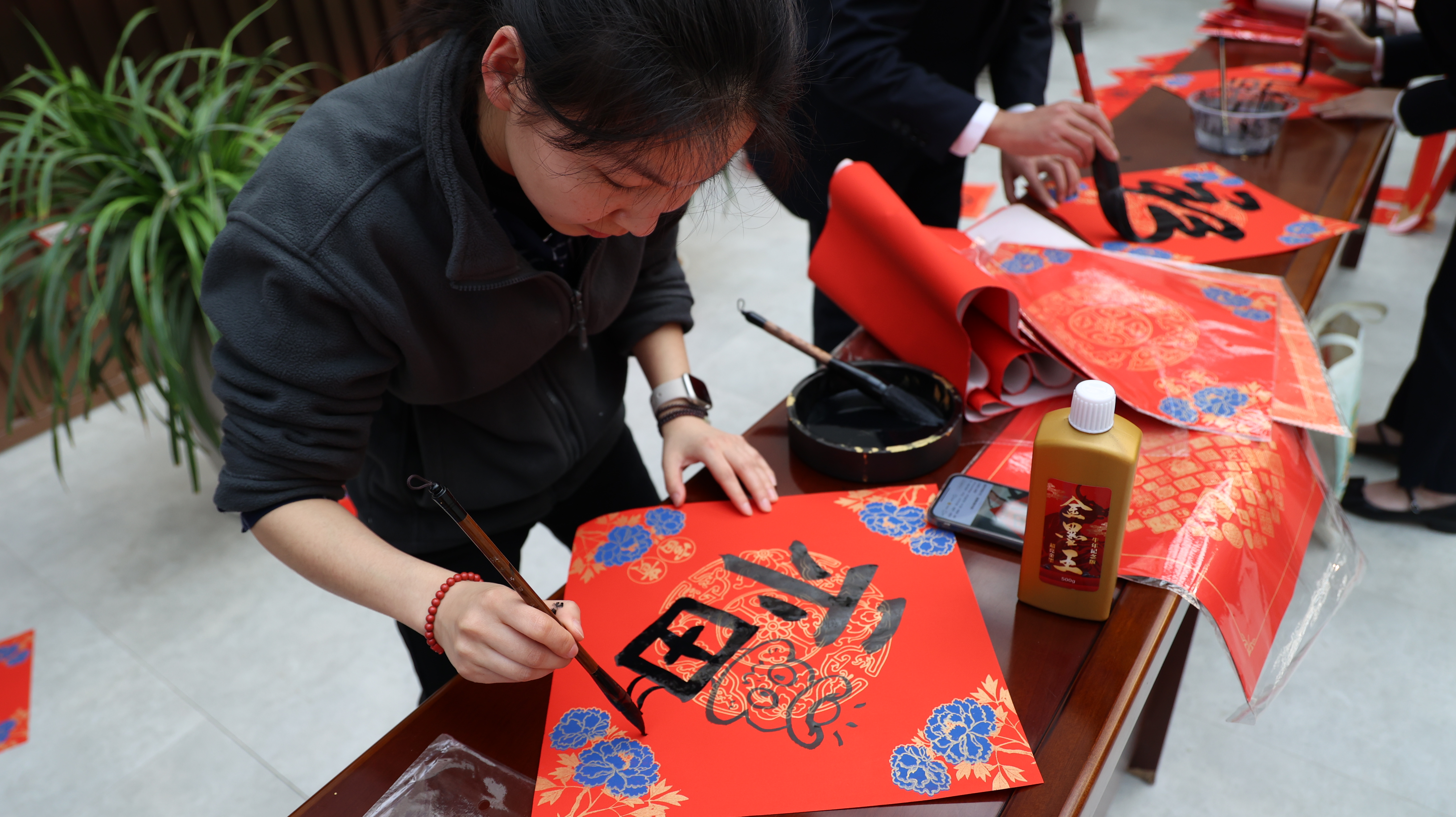 鋪紙,蘸墨,下筆……筆鋒婉轉(zhuǎn)間,一句句寓意吉祥的春聯(lián)躍然紙上;一幅幅福字表達了對節(jié)日的美好祝福。大家一邊寫一邊交流著書法技巧和過年的習(xí)俗,歡聲笑語此起彼伏。